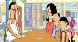 The credits sequence of Bob's Burgers often features the Belcher family at work. The scene is the kitchen of Bob's Burgers drawn with a black outline over a white background and the characters in full color, with the credits off to the right hand side. The sequence consists of Bob cooking a burger and Louise and Tina doing prep. Bob places the burger on the plate for Louise to give to Linda, who takes it from the window, and a few seconds later Gene walks through the kitchen wearing his burger costume.