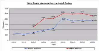 Average and highest attendances for Wigan Athletic at the stadium between the 2000–01 and 2008–09 seasons
