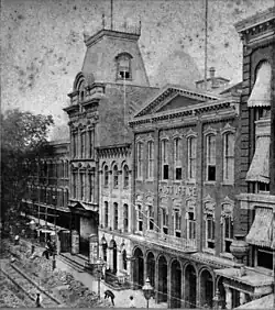 The Brooklyn Theatre opened on October 2, 1871 and stood near the southeast corner of Washington and Johnson streets[4] one block north of Brooklyn's City Hall.[5] It was owned by The Brooklyn Building Association, a partnership of affluent Brooklyn residents including Abner C. Keeney, William Kingsley, and Judge Alexander McCue.[6] After its destruction, the Brooklyn Daily Eagle called it Brooklyn's "principal theatre."[7] The theatre had been managed by Sara and Frederick B. Conway until the last 20 months of its existence; the Conways were long involved in New York and Brooklyn theatre, having managed Brooklyn's Park Theatre from 1864 to 1871.[8] Sara Conway died in April 1875,[9] about six months after her husband. Their children Minnie, Lillian, and Frederick Jr. then managed the theatre for a short time, but without success.[9] Albert Marshman Palmer[10] and Sheridan Shook were the manager and proprietor of New York's Union Square Theatre, and they assumed a new lease on the Brooklyn Theatre later in 1875, managing it until the catastrophe took place.[11]