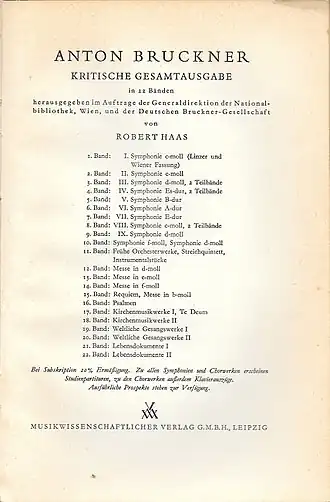 This first edition (12 volumes issued)[2][3] included 'hybrid' scores for Symphonies Nos. 2 and 8 and other similar conflations for some other revised works (Mass No. 3). - Neue Gesamtausgabe (1951–1989, Editorial Head: Leopold Nowak)