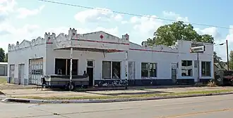 The Canute Service Station is a historic service station located along former U.S. Route 66 in Canute, Oklahoma. The service station was built in two sections; the western section opened in 1936 as a roadhouse, while the service station itself was added in 1939. The station was designed in the Pueblo Deco style, an architectural style which blended elements of the Art Deco and Pueblo Revival styles. The Pueblo Deco style was most popular in the Southwest, particularly among businesses on Route 66 looking to attract westbound travelers. The service station's Pueblo Deco elements include its stucco exterior, its castellated parapet decorated with tile diamonds, and its red tile roof.[2]