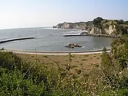 Cape Hachiman overlooks the Tangaura inlet and consists of several picturesque steep sea cliffs. Further south are several sandy beaches. It is notably the home of the Ōhara Fishing Port. At the precipice of the cape, there is a popular tourist esplanade, which can be dangerous on the days of high waves.