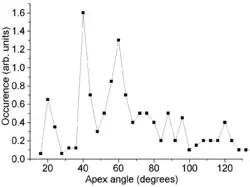 Carbon cones have also been observed, since 1968 or even earlier,[8] on the surface of naturally occurring graphite. Their bases are attached to the graphite and their height varies between less than 1 and 40 micrometers. Their walls are often curved and are less regular than those of the laboratory-made nanocones. The distribution of their apex angle also shows a strong feature at 60°, but other expected peaks, at 20° and 40°, are much weaker, and the distribution is somewhat broader for large angles. This difference is attributed to the different wall structure of the natural cones. Those walls are relatively irregular and contain numerous line defects (positive-wedge disclinations). This breaks down the angular requirement for a seamless cone and therefore broadens the angular distribution.[7]