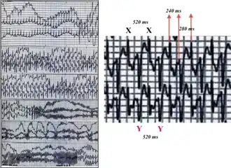 In 1960, Norwegian cardiologist Knut Berg published a report on three sisters who had blackouts during exercise or emotional stress in what is now recognised as the first description of CPVT.[8] The bidirectional ventricular tachycardia associated with this condition was described in 1975.[1] The term "Catecholaminergic Polymorphic Ventricular Tachycardia" was first used in 1978.[5] In 1999, the first genetic mutation causing CPVT to be identified was localised to chromosome 1q42-q43,[31] which was found to be a variant in the RYR2 gene in 2001.[6] Ongoing research aims to identify better treatments for CPVT, to increase understanding of the mechanisms of arrhythmia, and to identify other genes causing the condition.[32]