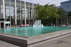 The cool, elegant, steel framed design was influenced by the architecture of Ludwig Mies van der Rohe[10] and echoed glazed shopping streets or arcades on the grand scale of the Galleria in Milan. The designer, Derek Walker, also likened it to the Crystal Palace.[11] It was described in 1993 as "still the best-looking if no longer the biggest shopping centre in the British Isles".[9] It is unusual for second generation shopping centres in Europe for the amount of daylight allowed into the public areas, for the rigorous control of retail facias along the arcades themselves, for its public art, the unusually high level of accessibility for visitors with limited mobility (and other users laden with children and shopping), the lavish extent of the public spaces and their interior planting (reduced since the buildings was completed) and for the cool mirrored exterior.