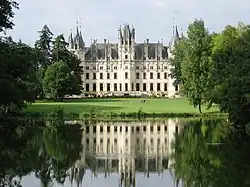 Hodé was a pivotal figure in the troubadour movement, distinguishing himself from other prominent neo-Gothic architects such as Eugène Viollet-le-Duc by not prioritizing historical accuracy. His objective was to create an idealized and romanticized vision of the Middle Ages, offering a Utopian portrayal of feudalism.[14] This revival sought to bring back a heroic and dark era during a time considered mundane and unremarkable by the legitimist aristocracy.[CD 4] The architectural style known as the troubadour style drew inspiration from literature and took a loose approach to historical accuracy, deviating from traditional medieval construction methods.[15] While the Château de Challain is adorned with neo-Gothic decorations, its underlying structure and layout adhere to neoclassical architectural principles.[CD 9] The Gothic influence is primarily seen in the decorative elements, as the facades maintain a symmetrical classical design, and the room distribution follows neoclassical conventions. The decorations are applied to a modern architectural framework, without which Challain would lack the Gothic aesthetic that defines it.[14] The side towers resemble those found in classical castles, while the central keep serves as a prominent feature. The traditional flat neoclassical roofs have been replaced with elaborate attics, further enhancing the Gothic appearance of the structure.[CD 9]