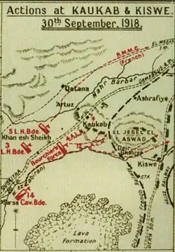 The Ottoman rearguard had been heavily fired on by the two Australian Mounted Division batteries, and would have seen the advance of the Régiment Mixte de Marche de Cavalerie to their right rear.[22][26] From Kaukab, Damascus was 10 miles (16 km) away.[27]