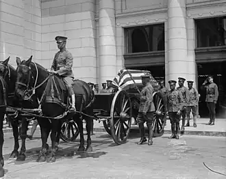 While Young was on a reconnaissance mission in Nigeria in late 1921, he suddenly became debilitatingly ill. Young died of a kidney infection at the British hospital in Lagos on January 8, 1922. Because his death took place in a British hospital, his body was required to be buried in Lagos where it remained for an entire year. During that year, Young's wife and many notable African Americans at the time demanded that Young's body be brought back from Nigeria so that he could receive "a proper military burial".[33] More than a year after his death, Young's body was finally exhumed and brought back to American soil. When his body finally made it to New York, he received a hero's welcome. There were large crowds of people there, all to pay honor to Young's long and accomplished military career.[33] He was given a full military funeral and was buried at Arlington National Cemetery in Section 3 across the Potomac River from Washington, D.C.[34] He was the fourth soldier to receive a funeral in Arlington Memorial Amphitheater. He is buried with a large tombstone that states his name, military rank, and year of birth and death; its other side simply says "Young".[35][33] He had become a public and respected figure because of his unique achievements in the Army, and his obituary was carried in The New York Times.[36]