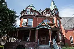 Charles and Joseph Raymond Houses consists of two historic homes located at Middletown, Dauphin County, Pennsylvania. They are two irregularly shaped brick and stone mansions in the Queen Anne style. They were built across the street from one another by two brothers, Charles and Joseph Raymond. The Charles Raymond House was built in 1891, and has a rusticated stone first story and a second story of brick. It features a variety of roof shapes and four articulated brick chimneys. The Joseph Raymond House was built in 1889, and has a rusticated stone first story and a second story of brick. It features a circular verandah and a square corner tower with an irregular pyramidal roof. It also has a large circular tower with a conical roof and a second floor balcony.[2]