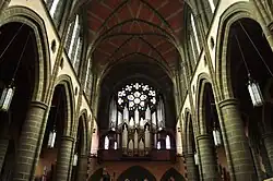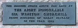 Funds were just sufficient to construct the nave, narthex and the lower portions of the northwest and southwest towers only. Vaulting was of brick rather than stone, and was flattened by two feet to reduce costs. The organ from the previous building was rebuilt on top of temporary vestries in the south-east corner of the nave. The east end of the nave was closed with a temporary wooden wall, and this much was consecrated on September 28, 1929. Winston Churchill visited the site several weeks earlier, on September 9, 1929, and was quick to help when the superintendent asked him to lay a stone on the north tower.[5]