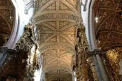 In the early 18th century the lateral aisles and apse chapels were extensively decorated with exuberant gilt wood work (talha dourada) by several Portuguese wood carvers. This decorative richness is the most notable feature of the Franciscan church, covering almost completely the roofs of the aisles, pillars, window frames and chapels and hiding the underlying mediaeval architecture. Even though the Baroque gilt work does not completely harmonise with the Gothic structure of the church, it is considered one of the most outstanding of Portugal.