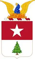 The star has a dual significance. Its five points represent the five forts in the Coast Defenses; in addition it represents the Pole Star, those being the most northerly defenses in the country. It is set on a field of artillery red. The pine tree is the emblem of Maine, and is on a white field symbolic of the snows among which this particular pine (Pinus Rigidus) grows. The motto translates to "We Defend the Land Gate." "Terrae Portam" is also the Latin equivalent for Portland and "Defendamus" is the motto of the Coast Artillery Corps.[2][43]