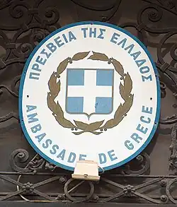 The coat of arms of Greece (Greek: Εθνόσημο, lit. 'national emblem', [eθˈnosimo] ⓘ) or national seal of Greece comprises a white Greek cross on a blue escutcheon, surrounded by two laurel branches. It has been in use in its current form since 1975. Prior to the adoption of the current coat of arms, Greece used a number of different designs, some of which were not heraldic; the first heraldic design was introduced in 1832 and its main element, the blue shield with the white cross, has been the base for all other national coats of arms since then. The design is a heraldic representation of the Greek national flag adopted in 1822, which featured a white cross on a blue field.