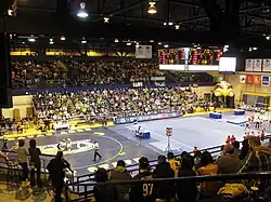 The layout of a collegiate wrestling dual meet taking place alongside a collegiate gymnastics meet