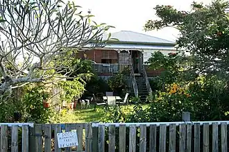 The c. 1909 house is highset on timber stumps, with an understorey screened with timber battens. The basic plan of the house, which faces to the northeast, consists of a pyramid roofed central section which houses three bedrooms and a lounge, and a kitchen/bathroom wing which extends southwest from the northern rear corner of the house. There are verandahs to the northeast, southeast and southwest. The northwest end of the northeast verandah has been enclosed with weatherboards and timber louvres, and the southeast verandah is enclosed with weatherboards and casement windows to form several small rooms. The L-shaped southwest verandah is enclosed with fibrous cement sheeting, and the section of this verandah along the southeast side of the kitchen wing has become a dining room. There is a stove recess clad with corrugated metal sheeting at the southwest end of the kitchen. An internal stairway runs from the enclosed southwest verandah down to the understorey. Internal walls are lined with vertical timber boards.[1]