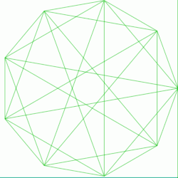 ![]() This complex polygon has 8 edges (complex lines), labeled as a..h, and 16 vertices. Four vertices lie in each edge and two edges intersect at each vertex. In the left image, the outlined squares are not elements of the polytope but are included merely to help identify vertices lying in the same complex line. The octagonal perimeter of the left image is not an element of the polytope, but it is a petrie polygon.[4] In the middle image, each edge is represented as a real line and the four vertices in each line can be more clearly seen. |