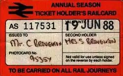 A card giving the same benefits, usually known as the Partner's Card but officially named Gold Card Partner's Network Card, is also available. Initially, Gold Card holders could have a free Network Card issued to them on behalf of a friend, relative or partner; but from 8 January 1989, the new Partner's Card (on dedicated APTIS ticket stock, form number BR 4599/69) was issued instead, at a cost of £1.00. A relative or friend of the Gold Card holder could be nominated, and the Partner's Card could be used independently of the Gold Card—the two cardholders did not have to travel together. The First Class Supplement benefit was withdrawn from Partner's Cards at the same time as from Network Railcards.[44] The card issued to the partner was later made once again a Network Railcard costing £1 and subject to the substantial minimum fare rule. This arrangement was eventually abolished in 2016; Gold Card holders may now purchase a 16–25 Railcard, Two Together Railcard, Disabled Person's Railcard, Senior Railcard, Network Railcard, or Family & Friends Railcard for themselves or anyone else for £10 by presenting the relevant application form and the Gold Card or Gold Record Card at a station in the Gold Card area.[42]