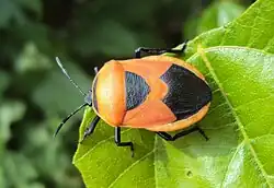 The antenna is five segmented with the third segment longer than the first which is shorter than all other segments, the body outline is oval. The scutellum is short and has a rounded apex. The proboscis tip extends past the coxae of the first pair of legs. They are yellowish to orange red in colour with a black stripe on the anterior pronotal edge sometimes broke in the middle. The basal half of the scutellum and the membrane of the forewing is also black.[3]