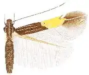 Female. Forewing length 3.5 mm. Head: frons shining ochreous-white with purplish reflection, vertex and neck tufts dark brown, medially and laterally lined white, collar dark brown; labial palpus first segment very short, white, second segment three-quarters of the length of third, dark brown with white longitudinal lines laterally and ventrally, third segment white, lined brown laterally; scape dark brown with a white anterior line, white ventrally, antenna shining brown, a white line from base to beyond one-half, followed towards apex by an annulated part of ten segments, two white, ten dark brown and approximately nine white segments at apex. Thorax and tegulae dark brown, thorax with a white median line, tegulae lined white inwardly. Legs: dark brown, femora of midleg and hindleg shining pale ochreous-grey, foreleg with a white line on tibia and tarsal segments, tibia of midleg with white oblique basal and medial lines and a white apical ring, tarsal segments one, two and four with white apical rings, segment five entirely white, tibia of hindleg as midleg, tarsal segment one with white basal and apical rings, segments two to four with white dorsal streaks, segment five entirely white, spurs white, ventrally with a greyish-brown streak. Forewing dark brown, five narrow white lines in the basal area, a short costal from one-third to the transverse fascia, a subcostal from base to one-third, bending inwardly in distal third, a medial above fold, starting beyond base and ending just before the transverse fascia, a subdorsal below fold, from one-fifth and ending just beyond the medial, a dorsal from beyond base to one-quarter, a broad yellow transverse fascia beyond the middle, narrowed towards dorsum with a short apical protrusion, bordered on the inner edge by two pale golden metallic tubercular subcostal and dorsal spots, the dorsal spot twice as large as the subcostal, the subcostal spot edged by a small patch of blackish brown scales on the outside and more towards base, bordered at the outer edge by two similarly coloured costal and dorsal spots, the dorsal spot more than twice as large as the costal spot and more towards base, the outer costal spot stretched and brownish edged on the inside, a white costal streak from outer costal spot, a shining white apical line from apical protrusion, cilia dark greyish brown around apex, ochreous-grey towards dorsum. Hindwing shining pale brownish grey, cilia ochreous-grey. Underside: forewing shining brown, the white apical line distinctly visible, hindwing shining pale grey. Abdomen dorsally dark brown, ventrally dark grey with a whitish longitudinal line, anal tuft yellowish white.[1]