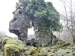 The surviving remains of the hall consist of a rectangular structure on a north-west to south-east axis with a central division that suggest two phases of construction as one half has walls that are narrower than the other. A dominant feature in the northern section is a fireplace with a substantial lintel, the remnants of window locations are discernible.[28] Pink harling was evidently used.[29] Prominent slots feature in the southern section of the surviving building may have been used for timber beams hinting at a cruck and thatched roof on a single storey building.[30]