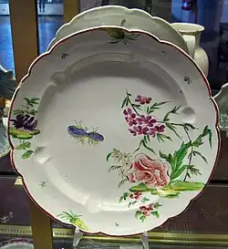 The factory was started by Geminiano Cozzi, a banker from Modena,[4] who had been involved with Nathaniel Friedrich Hewelcke, a German porcelain retailer from Dresden (near Meissen), who had moved to Venice. Hewelcke began producing porcelain there in 1758,[5] with Cozzi as a partner in the venture.[6] But by 1763 the factory had closed, with surviving pieces vanishingly rare.[7] The Hewelcke factory made the first porcelain produced in the city since Vezzi porcelain ceased production in 1727. In the meantime, in 1735 Doccia porcelain, near Florence, began production; it became the most important Italian porcelain factory, and continues in the 21st century.[8]
