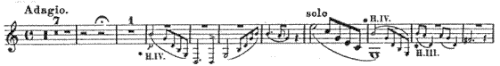 An example of cue notes. This example from the 2nd horn part Overture to Der Freischütz contains cue notes showing the 4th and 3rd horn parts, in order to aid proper entrance. Play