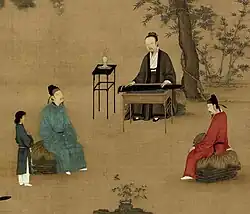 From Kaifeng, the zaju dramatic style employed the beiqu style of poetic lyrics.[30] After the capital had shifted to Hangzhou, the dramatic style of xiwen (also nanxi or nanqu) developed separately.[34] These two different regional genres of musical drama used different regional dialects of speech, recitation, and dialogue, entailed their own unique sets of role types (juese), and employed different types of musical instruments playing different tunes.[35] In Kaifeng drama, one singer was preferred for each play, accompanied by string and percussion instruments.[35] In Hangzhou drama, there was a multitude of singers on stage for each set, while string and wind instruments were preferred.[35]