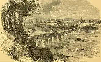 A second crossing in a slightly different location began construction on February 3, 1845, and was completed in 1846.[2] This bridge had an upper deck for railroad traffic, and a lower deck for pedestrian and wagon traffic. Use of the lower deck was discontinued when the bridge was strengthened in 1850.[1] The bridge's latticework timbers were removed and replaced with heavier braces from 1855 to 1856, and new wooden arches were built in 1872.[1] From 1880 to 1886, the piers beneath the bridge were gradually replaced, allowing it to carry much heavier traffic.[1]