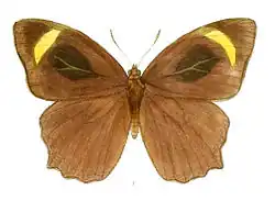 The branded evening brown is 75 to 85 mm in wingspan and broadly resembles the Melanitis evening browns, with a strong purple tinge above. The upper forewing has a narrow yellow apical band which does not reach the termen. The male has a large black brand on the upper forewing at the bases of 2 to 5 and the end cell.[3]