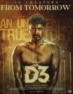 D3 is a 2023 Indian Tamil-language crime thriller written and film directed by Balaaji. The film stars Prajin, Vidya Pradeep, Charle, in the lead roles with Rahul Madhav, Abhishek Kumar, Varghese Mathew, Gayathiri Yuvaraj and Aroul D Shankar portraying supporting roles. The film was released theatrically on 17 March 2023.[1][2]