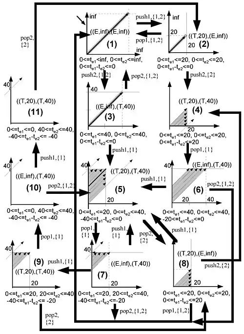 Fig. 5. shows the reachability graph of two-slot toaster which was shown in Fig. 2. In the reachability graph, each vertex has its own discrete state and time zone which are ranges of and . For example, for node (6) of Fig. 5, discrete state information is ((E,),(T,40)), and time zone is . Each directed arch shows how its source vertex changes into the destination vertex along with an associated event and a set of reset models. For example, the transition arc (6) to (5) is triggered by push1 event. At that time, the set {1} of the arc denotes that elapsed time of 1 (that is is reset by 0 when transition (6) to (5) occurs.[22]