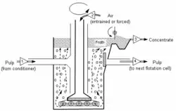 Froth flotation was adapted from the flotation process used in the mining industry in the 1960s. It is the most common deinking process in Europe used to recover recycled paper. Often most of the collector is added to the inlet of the flotation. The process temperatures are normally in the range 45 - 55 °C. Air is blown into the pulp suspension. The collector has affinity both to the ink particles and air bubbles, causing them to attach. The air bubbles lift the ink to the surface and form a thick froth that can be removed. Normally the setup is a two-stage system with 3, 4 or 5 flotation cells in series.[9] Flotation deinking is very effective in removing ink particles larger than about 10 μm.