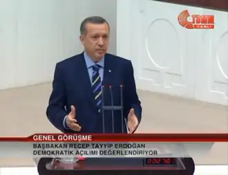 On the same day, Prime Minister Recep Tayyip Erdoğan called on parliamentary deputies to support the democratic initiative in respect to pluralist structure of the first Turkish Parliament, which commanded the country's independence war in the early 1920s. “Parliament is the stage where all issues will be frankly and freely debated. This Parliament cannot fall behind Mustafa Kemal Atatürk's Parliament. We cannot sacrifice the basic principles that were based on pluralism, freedom and democracy 89 years ago," Erdoğan said in his long-speech he delivered at the special session. Atatürk established diplomatic relations with the occupier countries as soon as the war was over, Erdoğan said, repeating his famous remark, “Peace at home and peace in the world.” The final aim is to reach national unity and brotherhood. It is a process of democracy,” he said while describing the move. The deputies representing the Republican People's Party (CHP), later left the parliamentary hall in protest. CHP leader Deniz Baykal commented that Erdoğan's Justice and Development Party was trying to divide the country. Erdoğan stated that he would travel to all 81 provinces to explain the content of the democratic initiative. He also accused the main opposition party CHP and the Nationalist Movement Party (MHP) of ignoring the citizens in eastern Anatolia. “The difference is richness,” he said.[15]