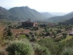 Ancient monastery with empty bell gables in the Desert de les Palmes mountains.