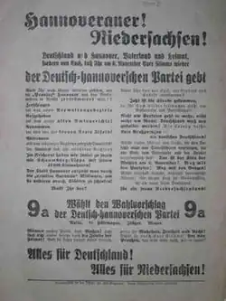 The DHP turned to more electoral means afterwards, and its pro-independence petition secured 600,000 signatures. The party also argued that Hanover contributed more in taxes to the welfare of Prussia and Germany than it received in return, expanding its appeal beyond the Guelph loyalty. This allowed it to win significant support in the District of Stade in 1918, which was previously the stronghold of the National Liberals.[16] The party then succeeded in having a plebiscite held in the Prussian Province of Hanover on 19 May 1924.[17]