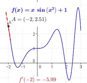 At each point, the derivative is the slope of a line that is tangent to the curve at that point. Note: the derivative at point A is positive where green and dash–dot, negative where red and dashed, and 0 where black and solid.