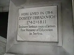 In 1783, he transferred to the University of Leipzig and published his first work.[6] He was a student of Johann Eberhard who himself was a disciple of Christian Wolf. More than a third of his life was spent in Austria where Obradović became influenced by the ideas of Joseph II and the German Enlightenment. Additionally, he was an Anglophile and influenced by English educators, seeing England as the land of spiritual freedom and modern civilization.[7] In 1785 Obradović presented his books printed in Leipzig to the British Museum Library in London. These were the first modern Serbian books acquired by the British Museum Library.[8] Besides these countries, his forty-year travel journeys across Europe and Asia Minor also took him to Greece, Hungary, Turkey, Romania, France, Russia, England, and Poland.