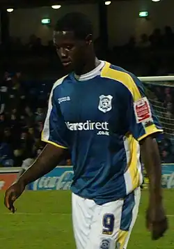 He joined Championship side Cardiff City on loan for the 2008–09 season in August,[18] making his debut for the club during a 2–1 victory over Milton Keynes Dons in the Football League Cup.[19] He went on to make his league debut four days later as an eighty-fifth-minute substitute in a 0–0 draw with Sheffield United.[20] He struggled to recover his goal-scoring form that he showed during his time in MLS.