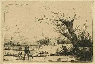 Linnig trained early on as an etcher and was one of the first to practise this art as an autonomous genre.[8] He is regarded as one of the first realistic engravers in Belgium. His etchings, while technically finished, preserve a character of free and swift execution.[1] The subject matter of his graphic work included marines and ship portraits as in his painterly oeuvre and extended beyond this to coastal landscapes, topographical views of harbours and city scenes as well as genre scenes with people such as fishermen and women busy on the beach, in ports or on markets. He also engraved a portrait of himself in the year before he died, which shows the bearded artist with hollowed out cheeks.