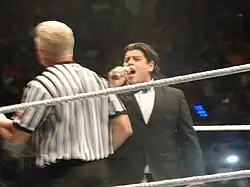On the May 21 episode of Raw SuperShow, Santino Marella criticised Rodriguez's announcing and then attacked Rodriguez.[33] Rodriguez unsuccessfully challenged Marella to a match on the May 25 SmackDown.[34] On the June 8 SmackDown, to tie in with Del Rio's feud with World Heavyweight Champion Sheamus, Rodriguez dressed up as Sheamus and mocked Sheamus' mannerisms. Rodriguez's portrayal of Sheamus was praised from critics and fans alike.[35][36][37] On the June 11 episode of Raw SuperShow, Rodriguez resumed his feud with Marella, teaming with Beth Phoenix to beat Marella and Layla. After the match, Marella embarrassed Rodriguez by ripping off Rodriguez's shirt to reveal he was wearing a Justin Bieber T-shirt underneath.[38] Their feud ended at No Way Out, when Rodriguez lost to Marella in a non-title tuxedo match, Rodriguez's first pay-per-view singles match.[39] In September 2012, during Del Rio's feud with Sheamus, Rodriguez suffered a Brogue Kick from Sheamus and thus enlisted David Otunga's help as his lawyer to try and ban the Brogue Kick.[40] Rodriguez was later pinned in a six-man tag match later that month with Del Rio and Otunga against Sheamus, Rey Mysterio and Sin Cara.[41]