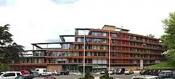 The furnishings of the former German chancery were sold at auction by the U.S. government in 1948, fetching slightly less than $50,000.[18] The chancery was auctioned by the U.S. government in 1951. Morris Cafritz was the high bidder, however, the government subsequently rejected his bid as too low.[19][20] It was thereafter sold by the U.S. government to James S. Kerwin for $165,000. United States Senator William Langer opposed the sale, saying the site should be held in trust by the U.S. government for the future use of Germany.[21] Four years later, the property was razed and turned into a parking garage.[22] In 1955 the United States established diplomatic relations with West Germany. The United States awarded the Federal Republic of Germany $300,000 from the earlier sale of the chancery and its furnishings, and a new chancery was occupied in Foxhall that year. The facility was constructed in a modern style and featured modern interior decor as, according to German diplomats at the time, the country "has no antiques now".[23][2][24]