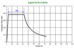 The warning signal is described by décret (by law) of March 23, 2007. It consists in a modulated sound going up and down (up to 380 Hz) during the first minute, and repeated three times. The end of alert is a continuous signal lasting 30 seconds.