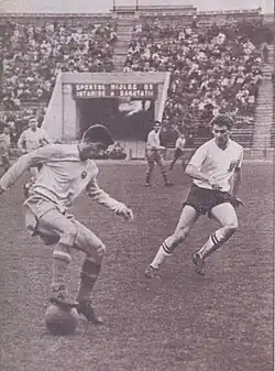 During his time at Rapid, Dumitriu made a successful partnership in the team's offence with Ion Ionescu, winning the first league title in the club's history in the 1966–67 season in which he scored 12 goals in 26 matches under coach Valentin Stănescu.[1][3][4][5] He made four appearances in European competitions for Rapid (including one in the Inter-cities Fairs Cup), most notably helping The Railwaymen eliminate Trakia Plovdiv in the 1967–68 European Cup and advance to the following round where they were eliminated by Juventus.[1][3][4][6] He also won two Balkans Cups, netting a brace in the 2–0 win in the second leg against Farul Constanța in the final of the 1964–66 edition.[4] For the way he played in 1966, Dumitriu was placed fourth in the ranking for the Romanian Footballer of the Year award.[7] He suffered a lung illness which kept him off the field for one and a half years and in 1968, Stănescu took him to Steagul Roșu Brașov, aiming to help him relaunch his career.[1][3][4] In 1971, Dumitriu went to play for one season at Dinamo București.[1][3][4] Afterwards he returned for two seasons to Rapid where he made his last Divizia A appearance on 10 March 1974 in a 2–0 away loss to Argeș Pitești, having a total of 235 matches with 68 goals in the competition.[1][3][4] Dumitriu ended his career by playing three seasons in Divizia B, the first one at Chimia Râmnicu Vâlcea and the other two at Progresul București, helping both teams earn promotion to Divizia A.[1][3][4]