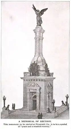 In 1913, as the 50th anniversary of the end of the Civil War approached, The Blue and the Gray Association of America proposed that a Peace Memorial be built in Fitzgerald, Georgia, the town where Confederate President Jefferson Davis had hidden from Union troops.[9] Viquesney's design featured a square stone pavilion with bronze sculpture groups above the cornice, and a stone tower crowned by a bronze goddess of Peace.[10]