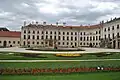 The first architect to work on the project was Johann Ferdinand Mödlhammer, succeeded in 1765 by Melchior Hefele.[1] While the palace is often compared to Versailles, which the Prince had visited in 1764 when he visited Paris,[2][3] H. C. Robbins Landon claims that a more direct influence can be found in "Austrian prototypes, particularly Schönbrunn palace in Vienna." Three of the windows above the main entrance are designed as homage to stringed instruments, namely violin, viola, cello.