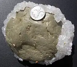 A cobble encrusted with halite evaporated from the Dead Sea, Israel (with Israeli ₪1 coin [diameter 18mm] for scale)