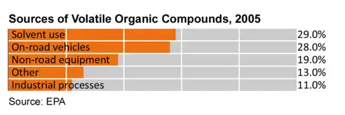 When oxides of nitrogen (NOx) and volatile organic compounds (VOCs) react in the presence of sunlight, ground level ozone is formed, a primary ingredient in smog. A 2005 U.S. EPA report gives road vehicles as the second largest source of VOCs in the U.S. at 26% and 19% are from non road equipment which is mostly gasoline and diesel stations.[18] 27% of VOC emissions are from solvents which are used in the manufacturer of paints and paint thinners and other uses.[19]