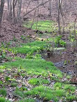 The Fairyland Pond as it appears today is artificial, having been created in the late 19th century when a dam was constructed. The dam’s drainage culvert was rebuilt in 2011. The inflow to the pond originates about 500 feet to the south at Brister’s Spring, named for Brister Freeman (mistakenly identified by Henry David Thoreau as ‘Scipio’ or ‘Sippio’ Brister),[3] a freed slave who lived with his family on the small hill from which the spring emerges.[4] The location of Brister’s house is now marked as part of the Drinking Gourd Project, which commemorates Concord’s role in the abolitionist movement.[5] The site was considered significant by Emerson, who would sometimes bring visitors to drink a glass of water from the spring.[2]