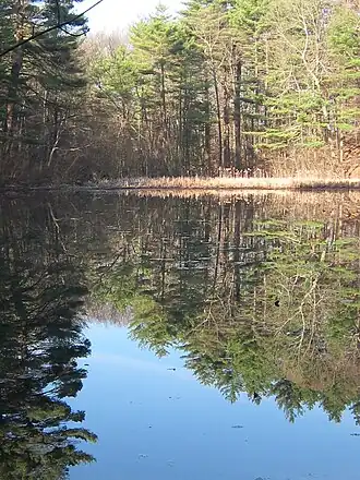 Like the nearby Walden Pond (about half a mile to the south), Fairyland lies within a kettle hole, a depression formed by a retreating glacier. The artificial pond itself covers an area of 2.75 acres. Unlike Walden Pond (which is the deepest lake in Massachusetts), the Fairyland Pond is relatively shallow, with a maximum depth of 4 feet. Its 60-acre watershed is largely undeveloped, lying mostly within the Hapgood Wright conservation area. A certified vernal pool[6] lies immediately to the west of the pond. The surrounding forest is primarily mixed hardwood, hemlock, pine and maple, and the area provides habitat for a diverse range of wildlife.[7]