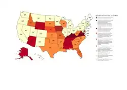 As of 2008, over 5.3 million people in the United States were denied the right to vote due to felony disenfranchisement.[18] In the national elections in 2012, the various state felony disenfranchisement laws together blocked an estimated 5.85 million felons from voting, up from 1.2 million in 1976. This comprised 2.5% of the potential voters in general. The state with the highest number of disenfranchised voters was Florida, with 1.5 million disenfranchised[19] because of a current or previous felony conviction, over 10% of the voting age citizens, including the 774,000 disenfranchised only because of outstanding financial obligations. In October 2020, it was estimated that 5.1 million citizens were disenfranchised for the 2020 presidential election on account of a felony conviction, 1 in 44 citizens.[3]